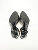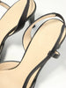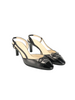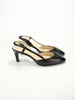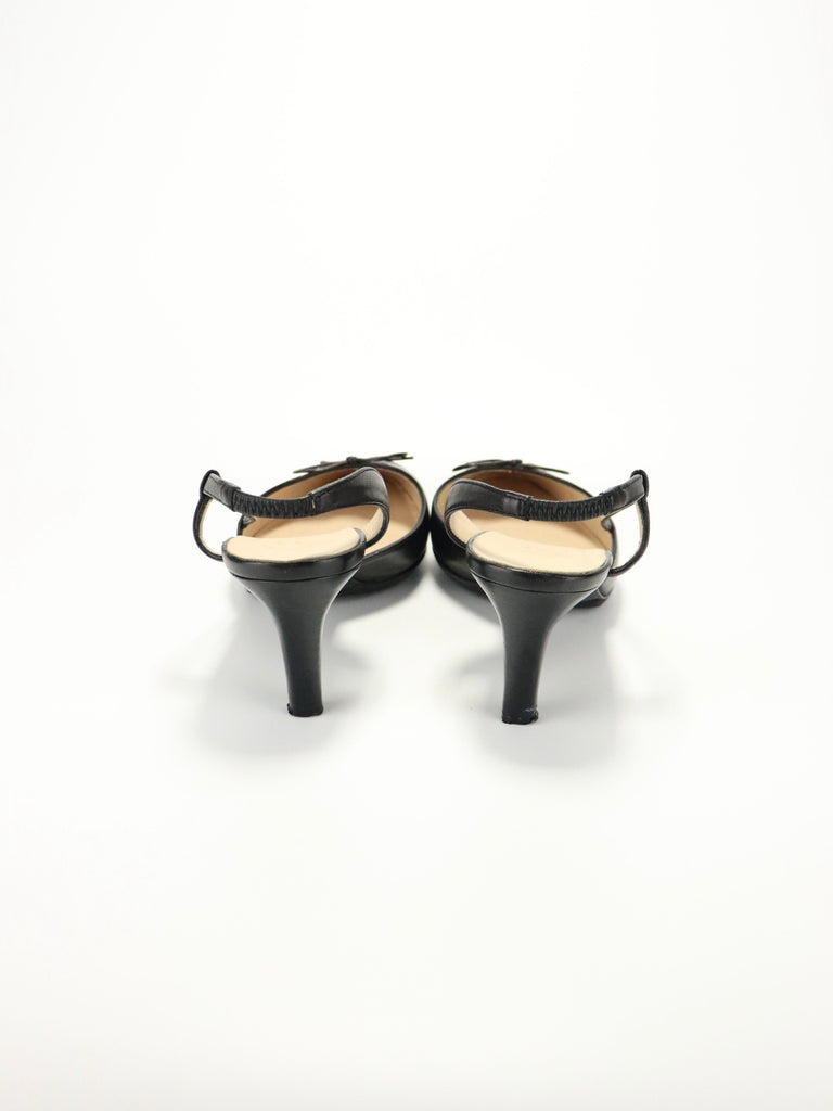 A timeless pair of Chanel slingback heels crafted in smooth black leather with patent cap toes and bow detailing.