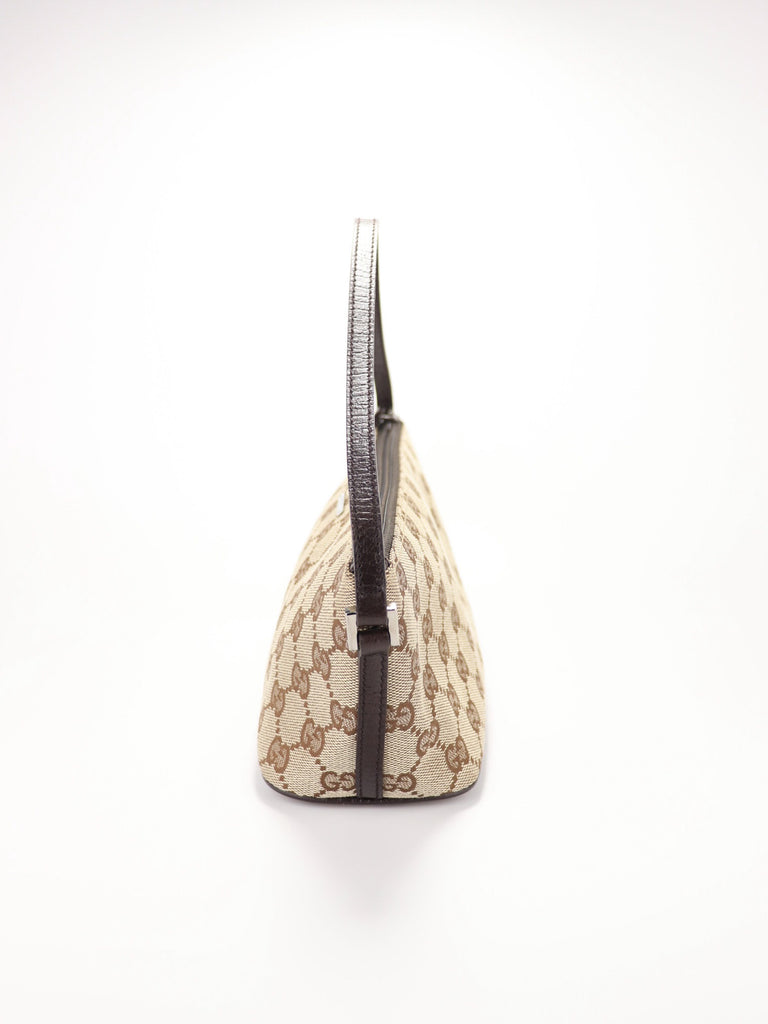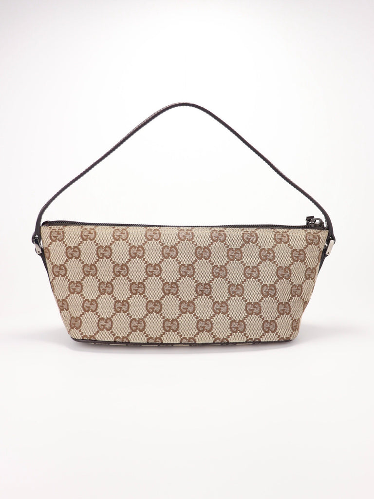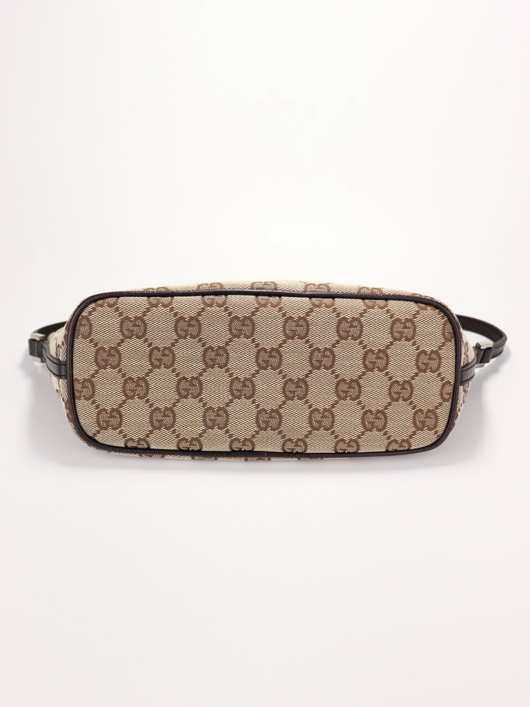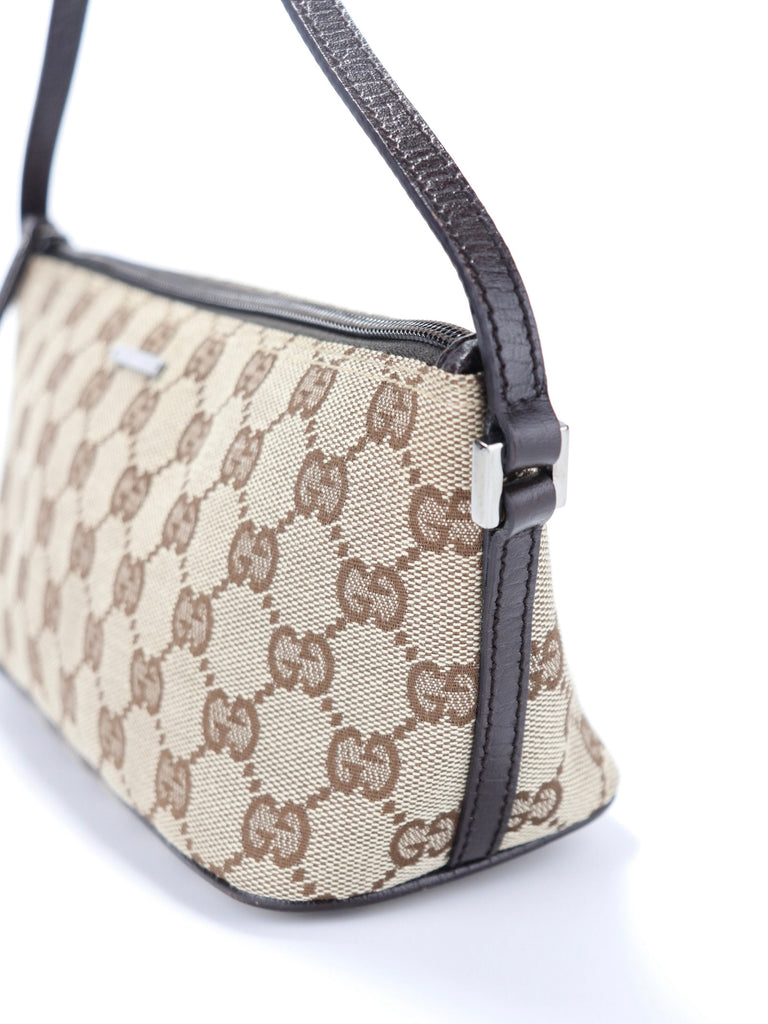 A classic Gucci shoulder bag crafted in the house’s signature GG canvas with dark brown leather trim.