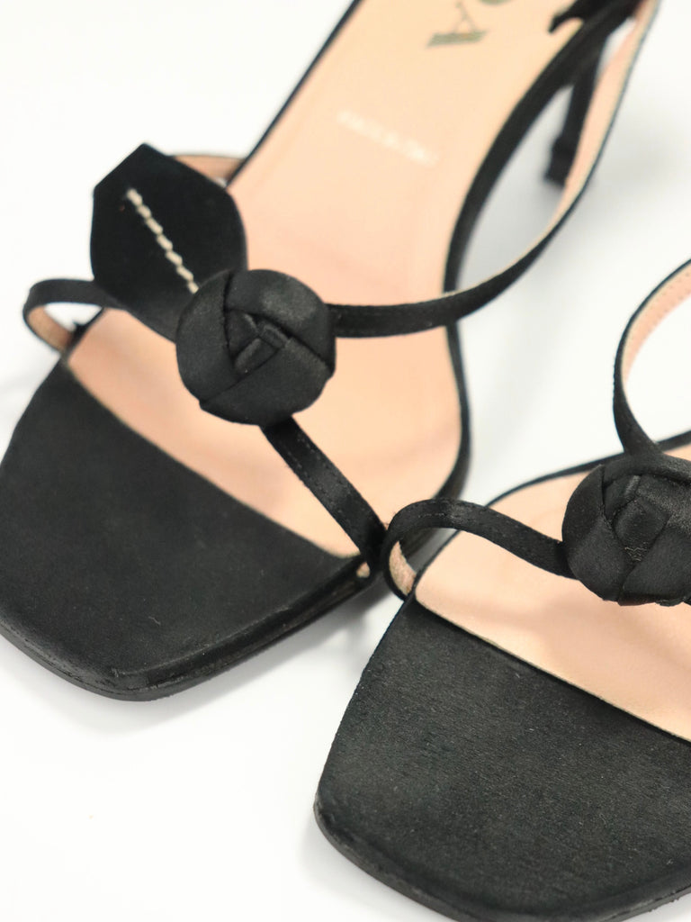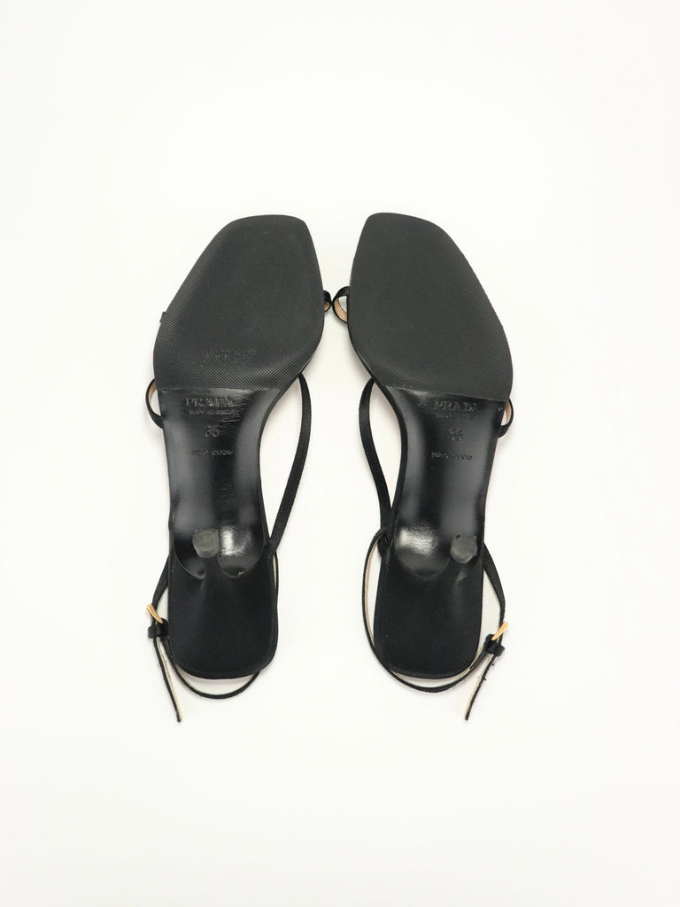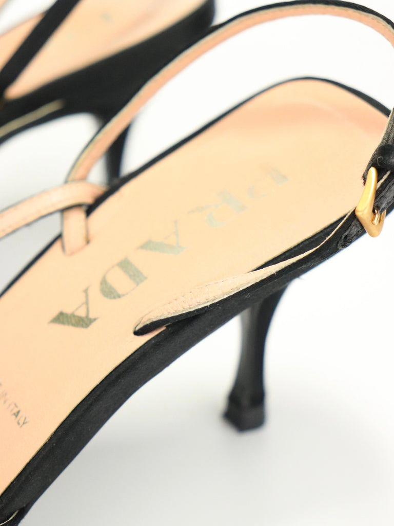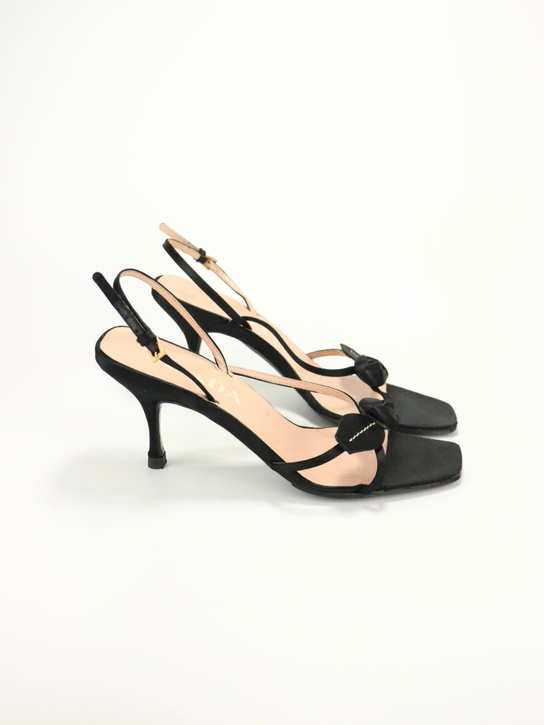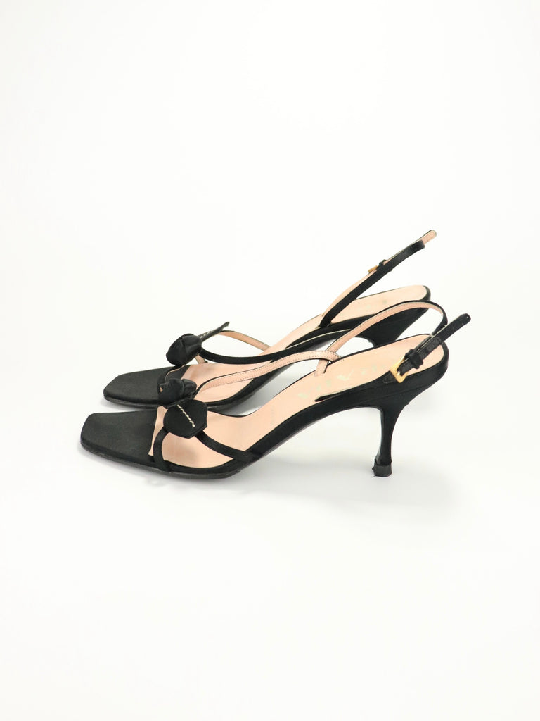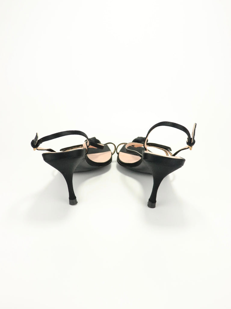 A dainty pair of Prada slingback heels crafted in black satin with delicate flower knot detailing.