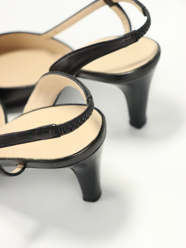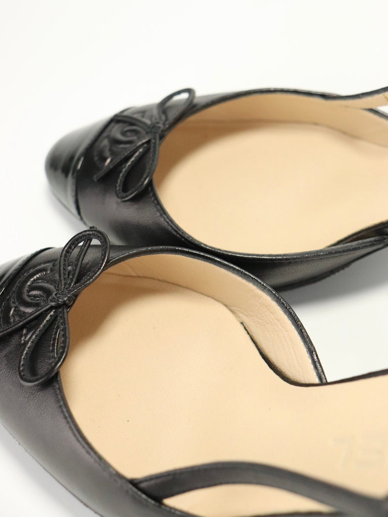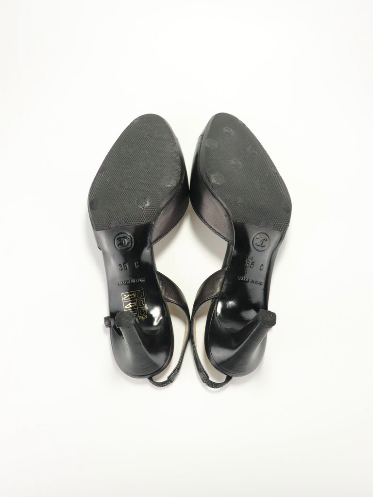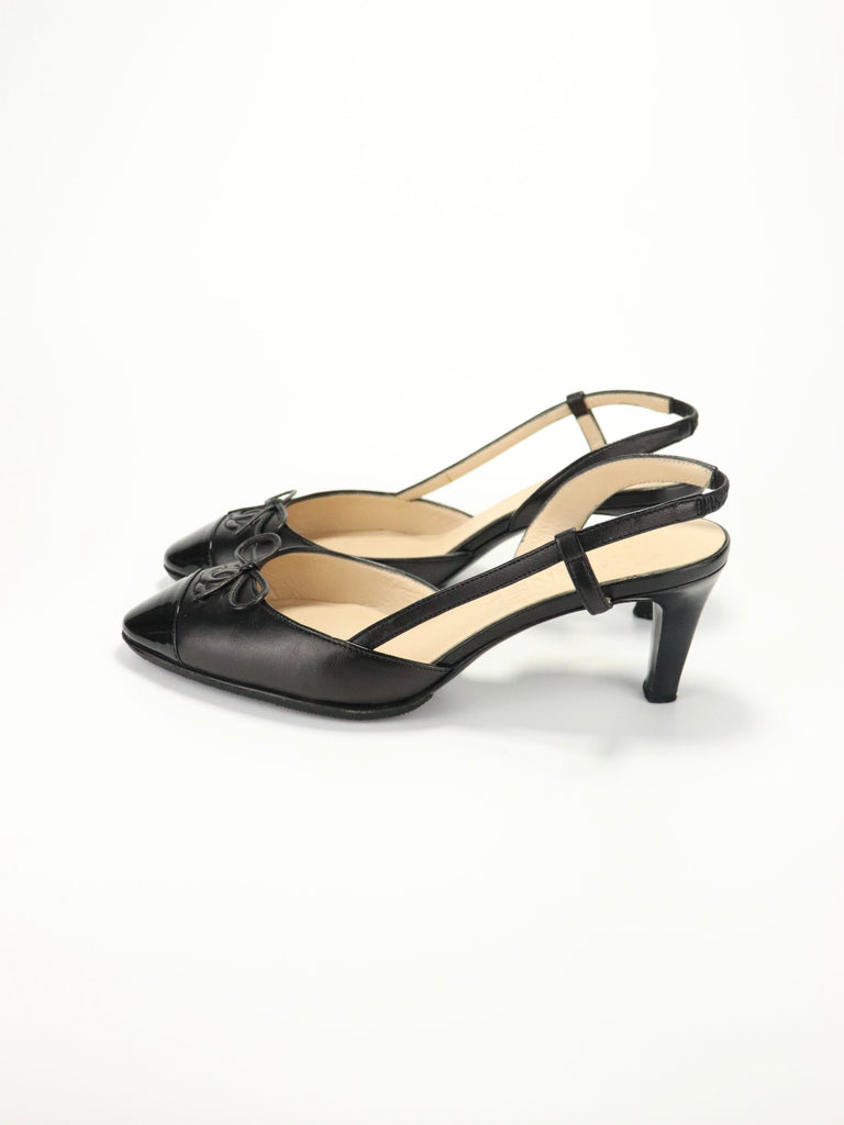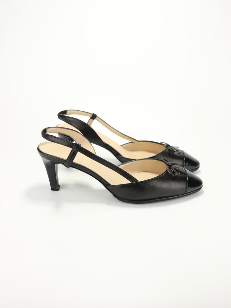 A timeless pair of Chanel slingback heels crafted in smooth black leather with patent cap toes and bow detailing.